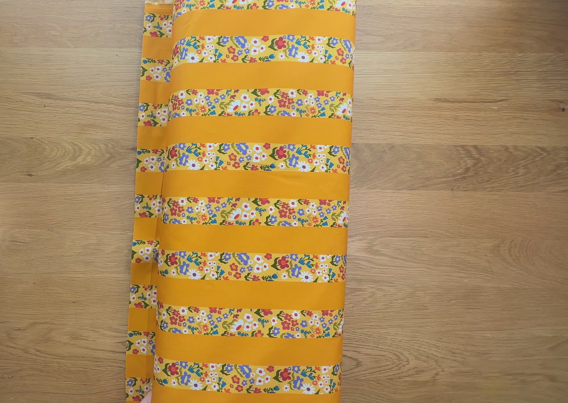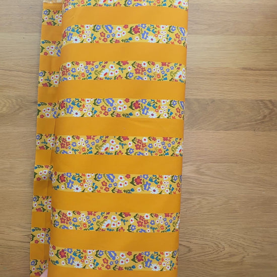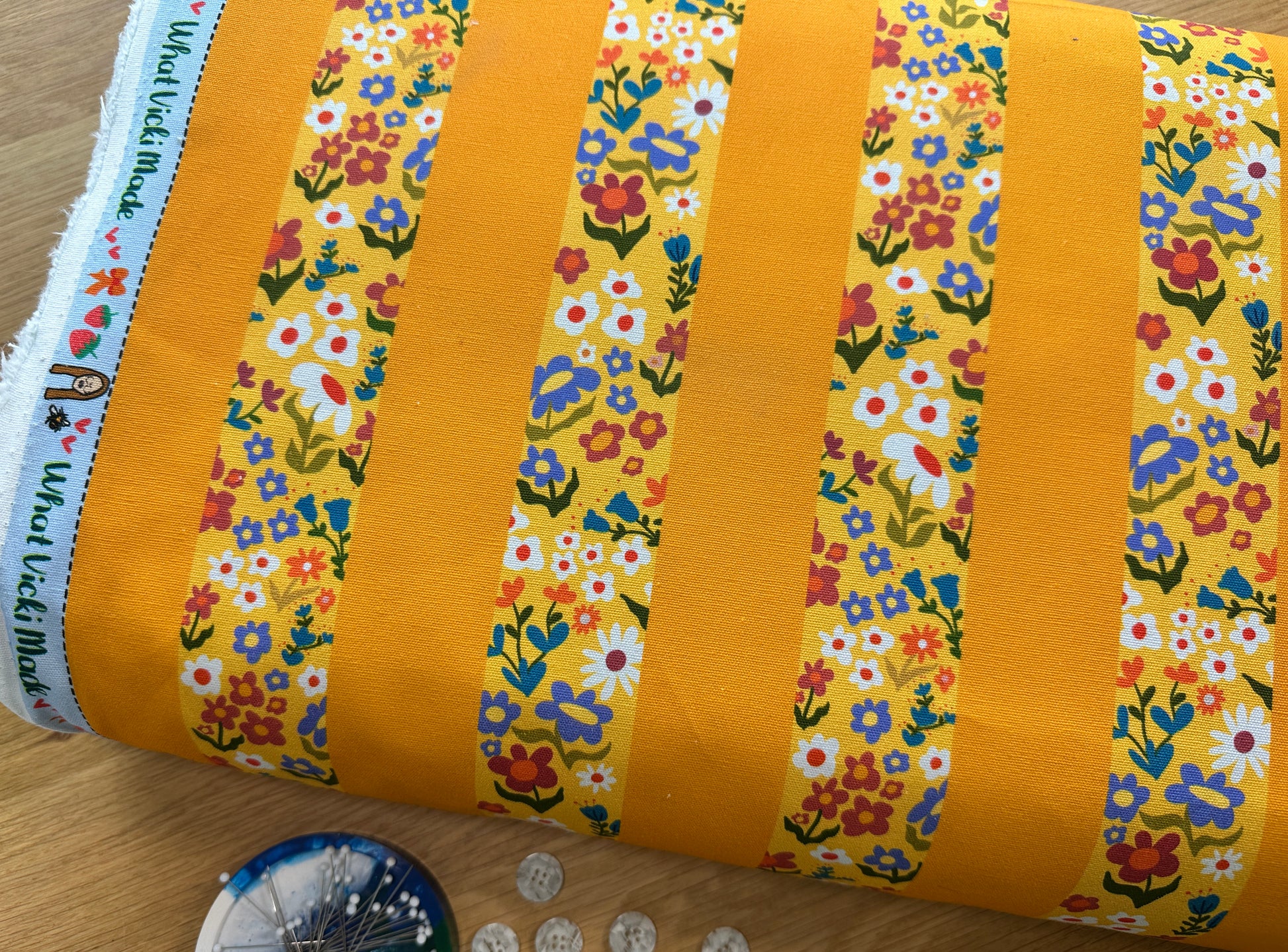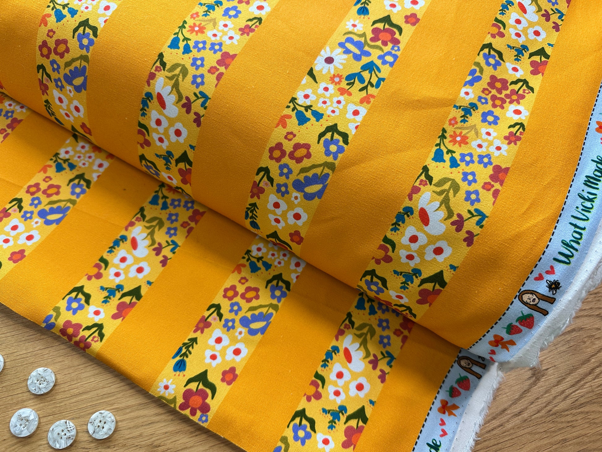 Blossom is 1 of 5 fabrics from the What Vicki Made Autumn/Winter 2025 collection. Classic bold stripes meets timeless floral illustrations in a beautiful yellow colourway.