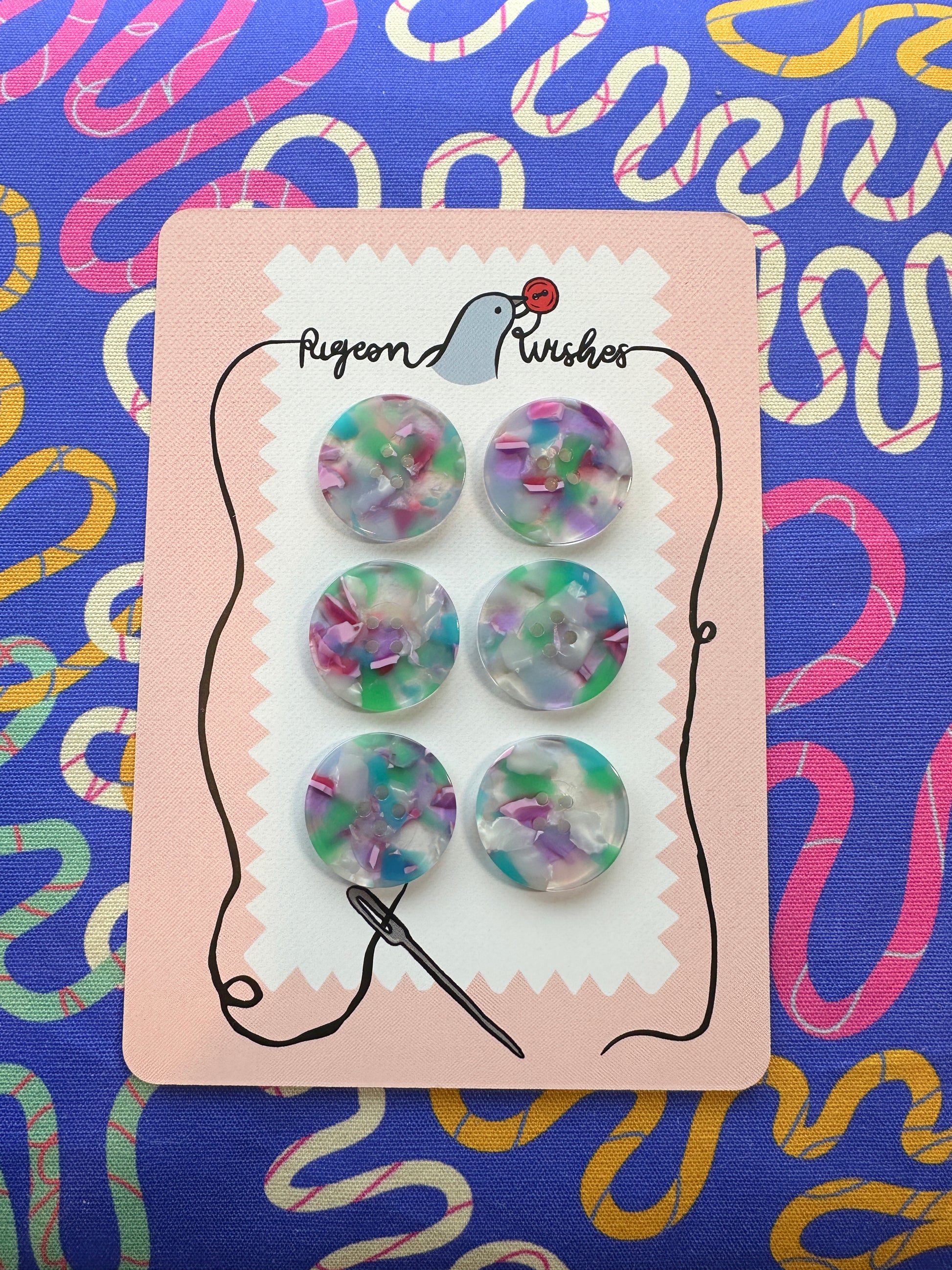 1 packet of buttons containing 6 buttons in total, 25mm in size. Each button is one of a kind, made from resin they are tough, glossy and have a smooth texture.